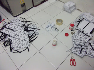 Finishingnya ternyata super ribet,,, banyak tahapan... Bikin amplop, bolongin amplopnya buat pasang pita, blom lagi bikin pita, pasang name card, hohoho...